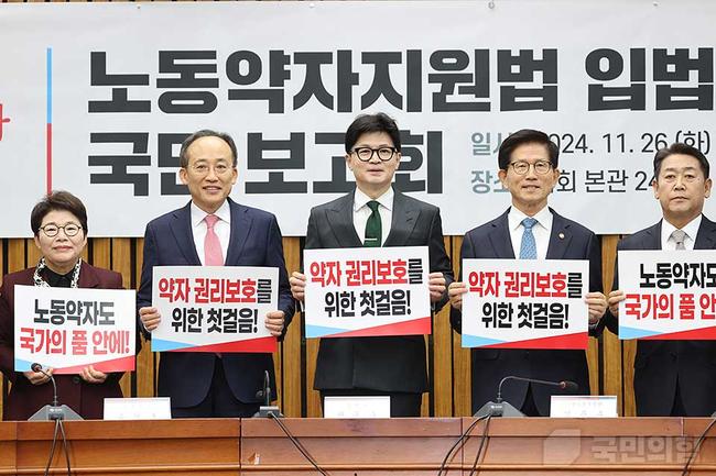 국민의힘 한동훈 대표는 26일 노동약자지원법 입법발의 국민 보고회에서 노동약자를 위한 새로운 법안을 발표하며, 법적 보호 사각지대를 해소하겠다는 의지를 밝혔다. 그는 "노조와 법적 울타리가 없는 노동약자들이 기댈 언덕을 마련하겠다"고 말했다.