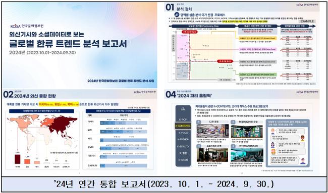 문화체육관광부(장관 유인촌)는 25일 한국문화정보원(원장 정운현)과 함께 전 세계 30개국에서 수집한 한류 관련 자료 68만 건을 분석한 ‘2024년 글로벌 한류 트렌드 분석 보고서’를 발표했다.