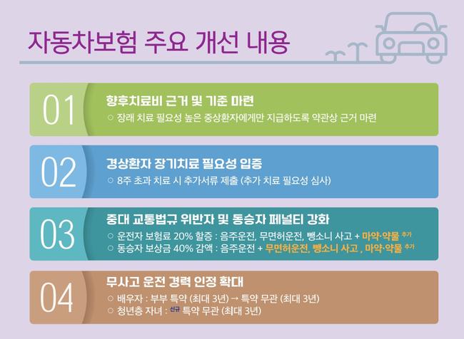 자동차보험, 합리적 보상·보험료 개선… 국민 부담 낮춘다 - 기준 없이 지급되던 향후치료비 제도화 및 경상환자 장기치료 개선 - 배우자·자녀 무사고 경력 인정 확대 및 중대 법규 위반 할증 개선