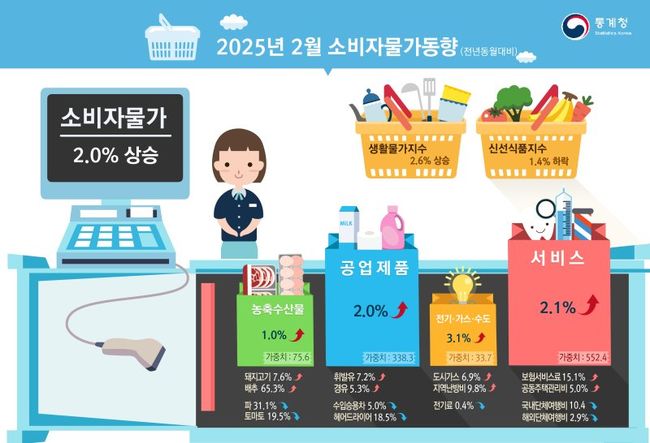 통계청이 발표한 2월 소비자물가지수(CPI)는 112.06(2020년=100)으로, 전월 대비 0.3%, 전년 같은 달 대비 2.0% 각각 상승한 것으로 나타났다. 이는 농축수산물, 공업제품, 서비스 가격 상승의 영향을 받은 것으로 분석된다.