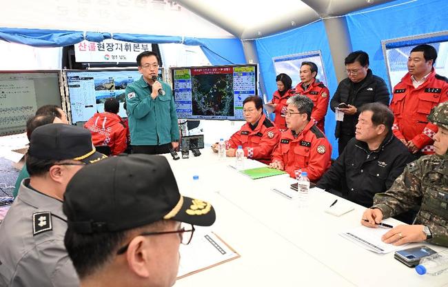 최상목 대통령 권한대행 부총리 겸 기획재정부 장관이 3월 22일 오후 경남 산청 산불진화 현장을 방문, 산불현장지휘본부에서 산불진화 상황을 보고 받고 인명과 시설피해가 발생하지 않도록 총력대응을 당부하고 있다.