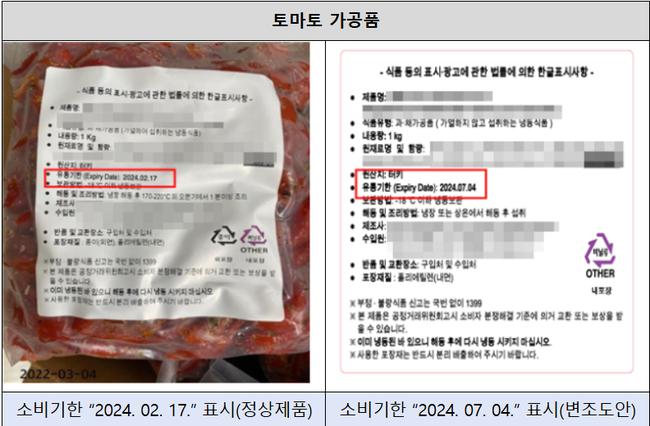 식약처, 수입식품 소비기한 조작 업체 검찰 송치 - 소비기한 지난 수입식품을 최대 451일까지 늘려 판매 - 튀르키예산 토마토가공품·스페인산 올리브유 등 총 16톤 유통 - 두 업체, 아세톤·레이저각인기 등 사용해 조직적 소비기한 변조