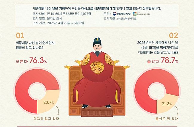 문화체육관광부는 국어문화원연합회와 함께 지난해 국가기념일로 지정된 ‘세종대왕 나신 날’을 맞아 4월 29일부터 5월 5일까지 세종대왕의 생신과 업적에 대한 국민 인식 조사를 진행했다. 이번 조사는 성별, 연령, 지역을 고려한 인구통계 비례 방식으로 총 1,077명이 참여했다.