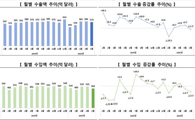 산업통상자원부는 2025년 5월 수출이 전년 동기 대비 1.3% 감소한 572.7억 달러, 수입은 5.3% 감소한 503.3억 달러를 기록했으며, 무역수지는 69.4억 달러 흑자로 집계됐다고 발표했다. 누적 무역수지 흑자 규모는 190억 달러에 달한다.