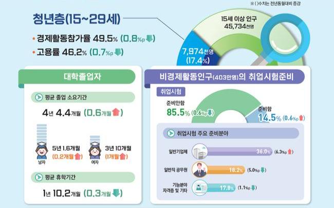 청년층 고용률 46.2%…취업자·경제활동 참가율 동반 하락 - 통계청 “2025년 5월 청년 인구 20만 명 감소…취업자도 15만 명 줄어” - 대졸 소요기간 증가…첫 일자리 평균 근속기간은 1년 6개월 수준 - 취업준비 중인 청년, 비경제활동인구 14.5%…‘그냥 시간 보내는 중’도 25% 넘어