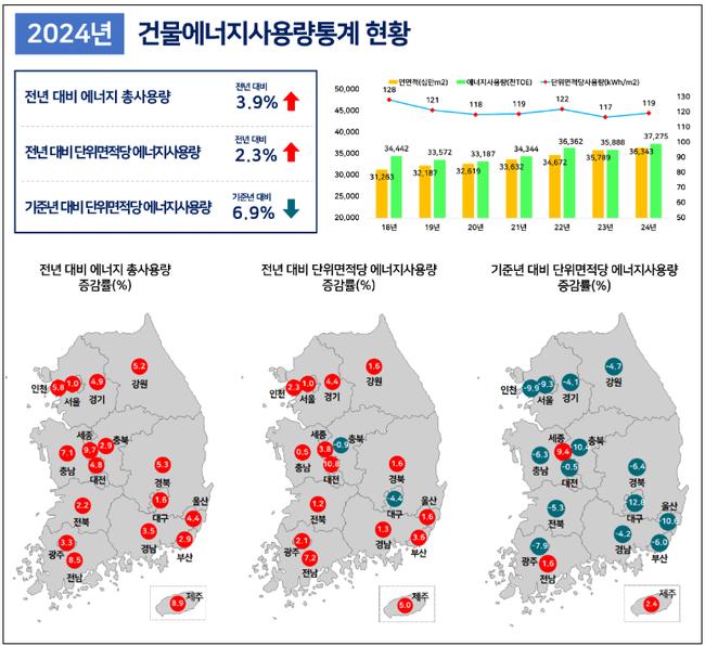 국토교통부가 건물의 용도·지역별 에너지 사용량 기준을 처음으로 공개한 가운데, 2024년 건물에너지 총사용량은 전년보다 3.9% 증가한 반면, 기준연도인 2018년 대비로는 6.9% 감소한 것으로 나타났다.