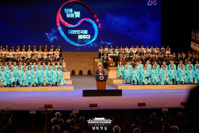 이 대통령은 급변하는 국제정세 속에서 반도체·인공지능 등 첨단 기술 육성, 에너지 전환 가속화, 문화 역량 강화 등을 통한 ‘새로운 100년 도약’을 약속하며 “국민의 저력으로 어둠 속에서도 길을 잃지 않고 나아갈 수 있다”고 말했다.
