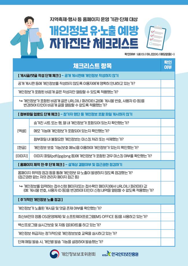 이에 개인정보위는 지방자치단체와 운영 기관에 각별한 주의를 요청하고, 안전한 홈페이지 운영을 위한 자가점검표를 배포할 예정이다.