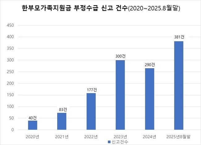 국민권익위에 따르면 한부모가족 아동양육비 부정수급 신고 건수는 꾸준히 증가하는 추세다. 2020년 40건에 불과하던 신고는 2025년 8월 말 현재 381건으로 5년 사이 852.5% 급증했다.