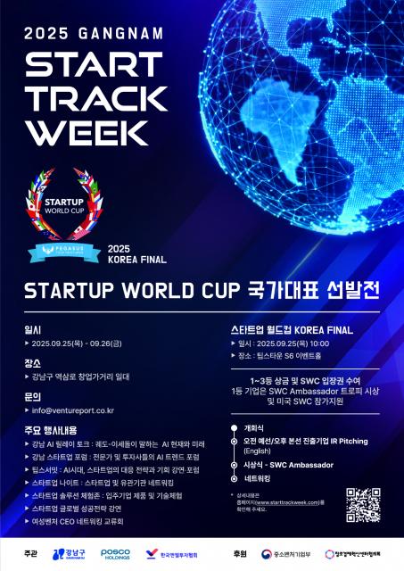 전 세계 스타트업의 경쟁 향연이 펼쳐지는 글로벌 IR 대회인 `Startup World Cup 2025`의 한국 대표기업 선발전이 `2025 GANGNAM START TRACK WEEK`의 메인 행사로 열린다