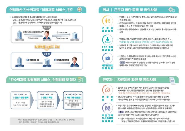 연말정산 간소화자료, 11월 30일까지 일괄제공 서비스 신청해야…편의·보안 강화 - 국세청, 회사가 근로자 대신 자료 수령하는 ‘일괄제공 서비스’ 신청 접수 - 올해 휴대폰 문자 인증 추가…IT 취약계층 이용성 개선 - 발달재활·장애인활동지원 자료는 별도 다운로드 필요