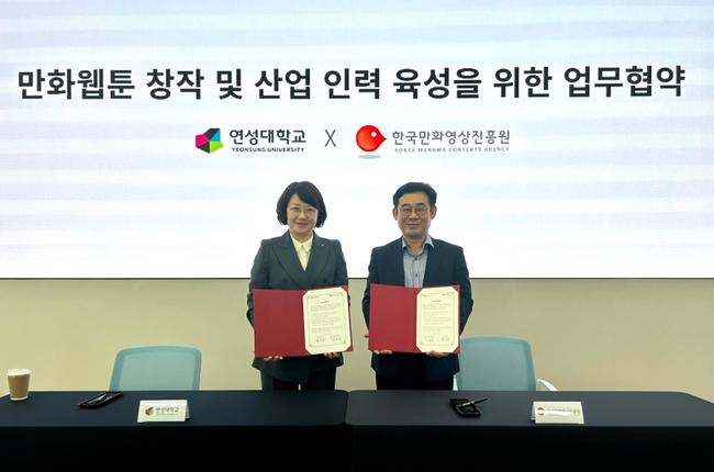 한국만화영상진흥원(원장 신종철, 이하 진흥원)과 연성대학교(총장 권민희)는 7월 11일(목) 웹툰융합센터에서 인재 양성과 직업교육 혁신 및 만화 웹툰의 가치 증대를 위한 업무협약을 체결했다.