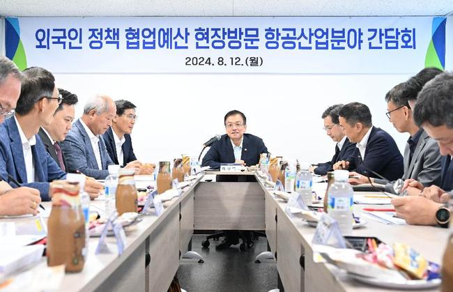 최상목 부총리 겸 기획재정부 장관이 8월 12일 오전 외국인 정책 협업예산 항공산업분야 관련 경남 사천 항공우주산업진흥협회(경남지부)를 방문, 항공업계 관계자들과 간담회를 하고 있다.