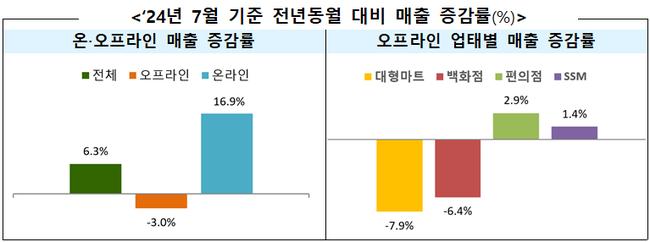 7월 유통업체 매출, 오프라인 3% 감소·온라인 16.9% 증가 `희비` - 산업부, 7월 주요 유통업체 매출 발표...주요 유통업체 매출 6.3% 증가 - 오프라인 대형마트·백화점 부진 지속...쇼핑 패턴 변화와 계절적 요인 복합 작용