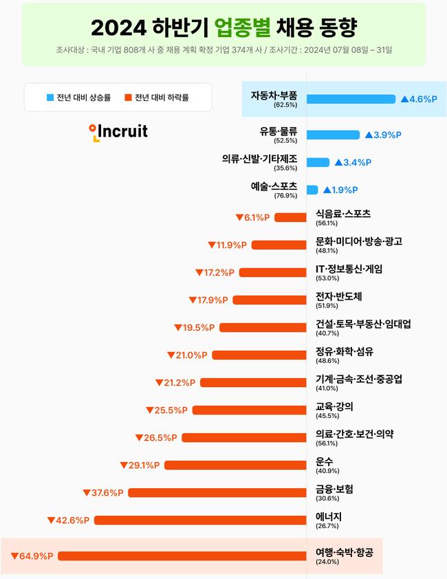 인크루트, ‘2024 하반기 업종별 신입 채용계획’ 분석 결과 발표 - 13개 업종 채용계획 전년비 하락…‘자동차·부품’ 업종 소폭 상승 - ‘여행·숙박·항공’ 업종 64.9%P로 전년 대비 가장 큰 폭 하락