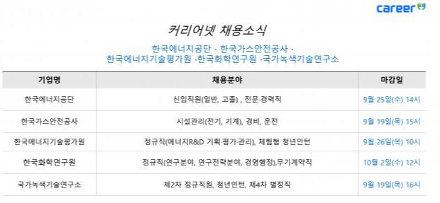 취업 포털 커리어가 한국에너지공단, 한국가스안전공사, 한국에너지기술평가원, 한국화학연구원, 국가녹색기술연구소 등의 채용 소식을 12일 발표했다.